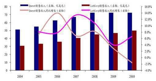 在行业发展初期,企业主要是通过高速扩张、快速抢占市场份额、做大规模从而降低成本,来实现企业迅速做大做强。而在行业发展后期,简单的外延式增长已不能满足企业发展的要求。在地域扩张日趋萎缩、常规检测领域渐趋饱和的情况下,企业盈利主要由毛利率高的高端项目(如基因/分子诊断)等驱动。如 2006-2010年Quest常规检测,基因和组织诊断销售的复合增速分别为0%、12%、15%;Labcorp常规检测,基因和组织诊断销售的复合增速分别为6%、11%、0%。2010年,Quest的收入中常规的诊断超过50%,解剖病理超过10%,基因和复杂检测超过20%。两家公司高端检测(基因/分子诊断)储备丰富,从单基因疾病(如HIV,HPV)到多基因疾病(如肿瘤、代谢疾病)等众多领域。自1994年以来,两家公司并购进程加快,高毛利检测项目并入、产品齐全带来规模化效应,促使公司毛利率不断提升。