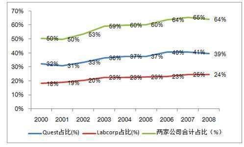 图表2:2000-2008年Quest和Labcorp市场占有率变化图